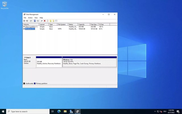 To access the Disk Management tool, simply right-click on the Windows logo located in the bottom left corner. From the menu, choose “Disk Management.” Here, you’ll find a comprehensive view of all current partitions and connected hard drives. In this instance, a single 200 GB hard drive is visible, which is standard for a Virtual Private Server (VPS). Dedicated servers may feature multiple connected hard drives.